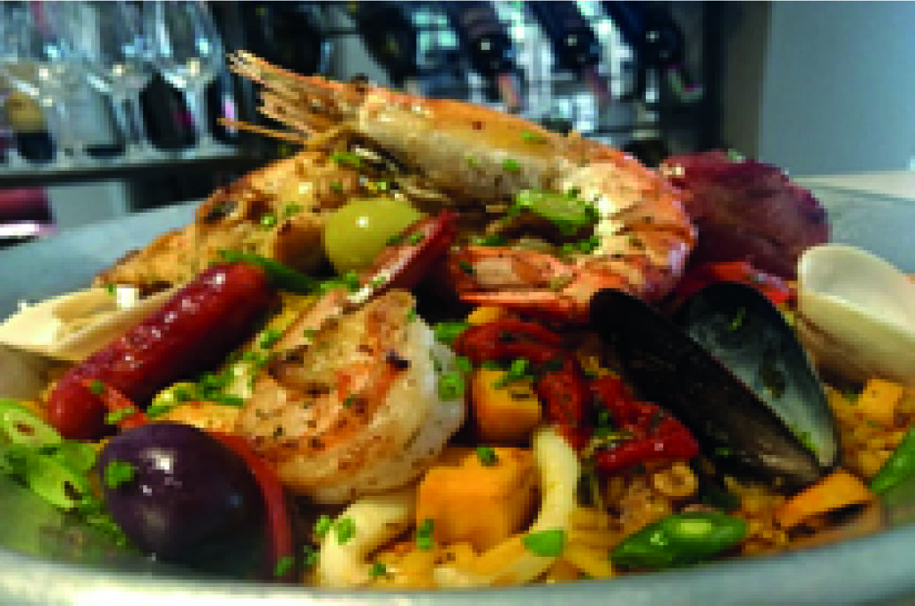 Paella; Colombinas de pollo, choricillo, costillita ahumada langostino, gamba, camarones, calamar,