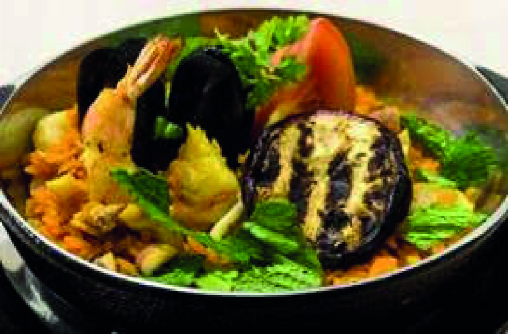 Arroz cremoso, langostino, pulpo, mejillón, camarón, berenjena, tomate