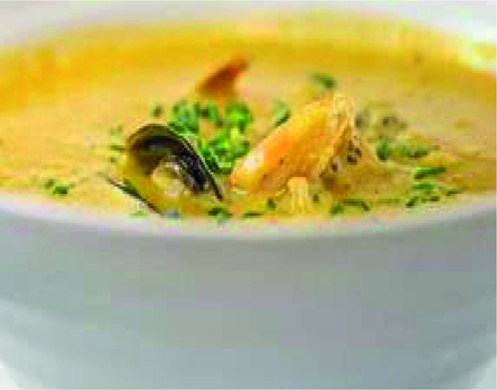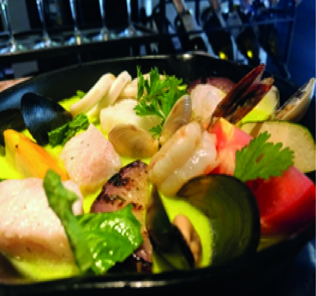 Cazuela de Mariscos,  Bisque de mariscos, leche de coco, jengibre, albahaca, limonaria, servido