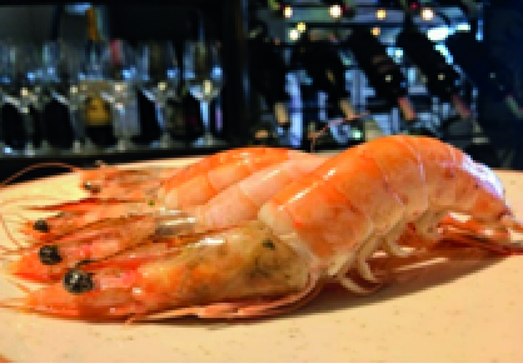 Gambas a la sal, guindillas, ajo crocante