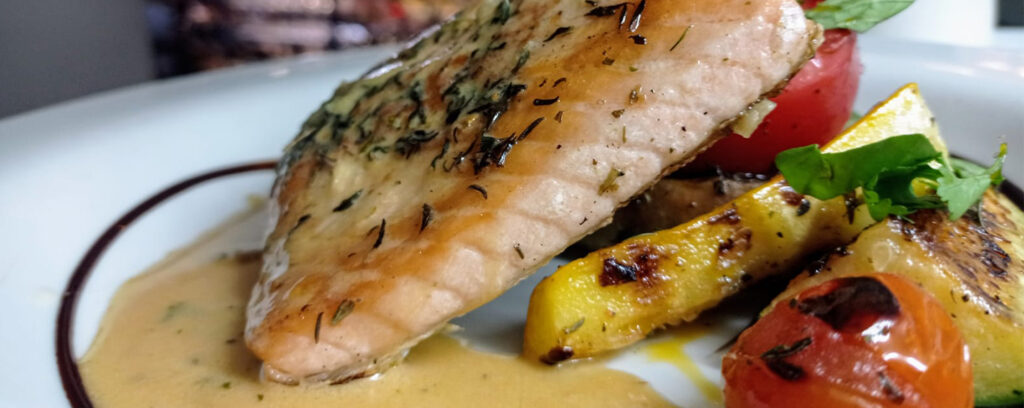 Filete de salmón, mantequilla de miso y soya, servido con vegetales asados, tomates,